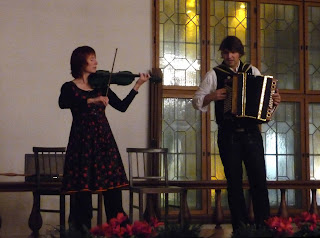 Im Hintergrund dräut das - übrigens großartige - Büffet (Christine Strobl: ich sage dann nicht "das Büffet ist eröffnet - es ist schon eröffnet"). Vor lauter Singen hab ich vergessen, das köstliche gefüllte Schweinefilet zu fotografieren. Hab's natürlich gegessen, wer kann gutem Essen schon widerstehen.Monika Drasch mit Dudlsack, und Siegfried Haglmo mit Harmonika, sehr gut drauf